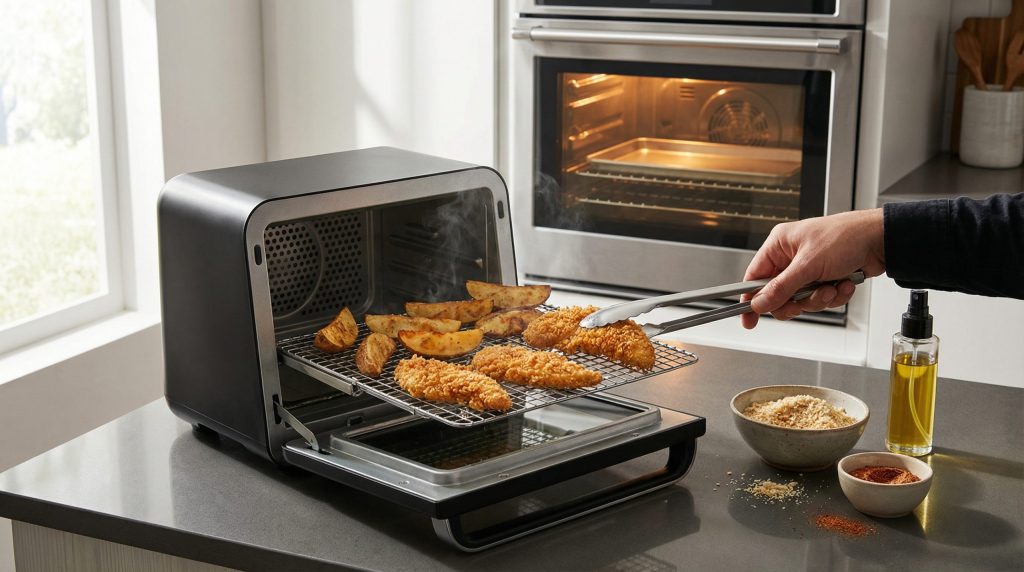 Adaptar receitas para forno e airfryer exige foco em circulação de ar, pré‑aquecimento e porções. Para crocância, prefira porções únicas, cestas não sobrecarregadas e empanamentos firmes — panko e leve óleo ajudam muito. Para frango e empanados, use termômetro e marinadas; para legumes e batatas, cortes uniformes e camadas únicas fazem a diferença. Ajuste tempos em função do aparelho e do volume por fornada, e lembre‑se dos custos energéticos ao escolher entre forno e airfryer em preparos longos.