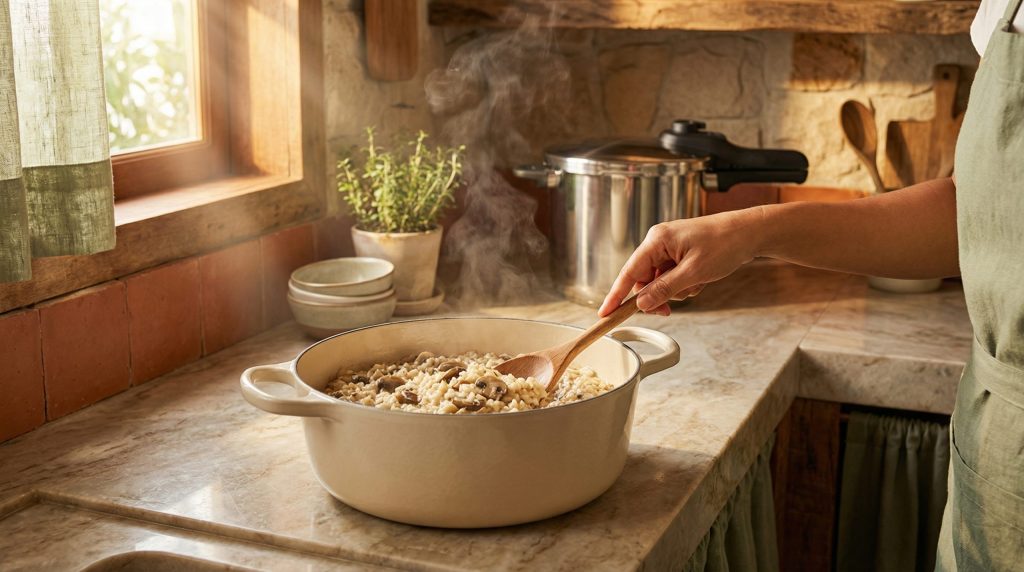 O mesmo se aplica aos risotos. Embora a técnica tradicional italiana peça a adição gradual de caldo, versões práticas permitem adicionar o caldo de uma vez, desde que a panela seja mantida tampada e em fogo baixo. O resultado é um prato reconfortante, cremoso e pronto em menos de 20 minutos.