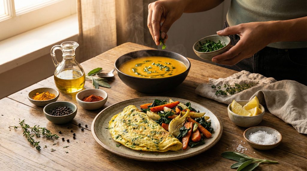 O aspecto visual e a textura são cruciais para a saciedade. Um jantar leve não deve ser “líquido demais”, pois isso pode acelerar a fome logo depois. Finalize suas sopas com sementes de abóbora tostadas, gergelim, lascas de amêndoas ou croutons feitos de pão integral torrado com ervas. Esses elementos exigem mastigação, enviando sinais de saciedade ao cérebro mais rapidamente.