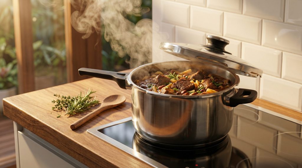 Utilizar a pressão não é apenas uma questão de textura, mas de sustentabilidade doméstica. Cozinhar um corte de carne de segunda em panela aberta pode levar mais de duas horas, consumindo uma quantidade significativa de gás. Na pressão, esse tempo cai para 30 ou 40 minutos. Essa eficiência térmica permite que você prepare bases para a semana inteira em uma única sessão de cozinha, otimizando recursos financeiros e energéticos.